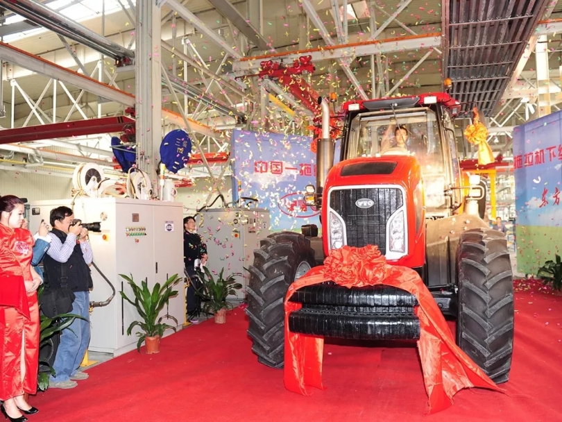 2005年中国最大的大功率轮式拖拉机在一拖批量下线日“东方红”动力换档重型拖拉机驶下总装线